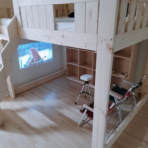 높은 원목 벙커침대를 올라가시면 이렇게 아늑한 침대가 준비되어 있습니다.:) 원목 벙커 침대의 침대는 모두 슈퍼싱글 사이즈입니다.다른 사이즈로도 주문제작 가능합니다.특히! 앞으로 아이들이 성장하여 각 방을 사용할 때 각각의 단일 침대로 사용할 수 있습니다!